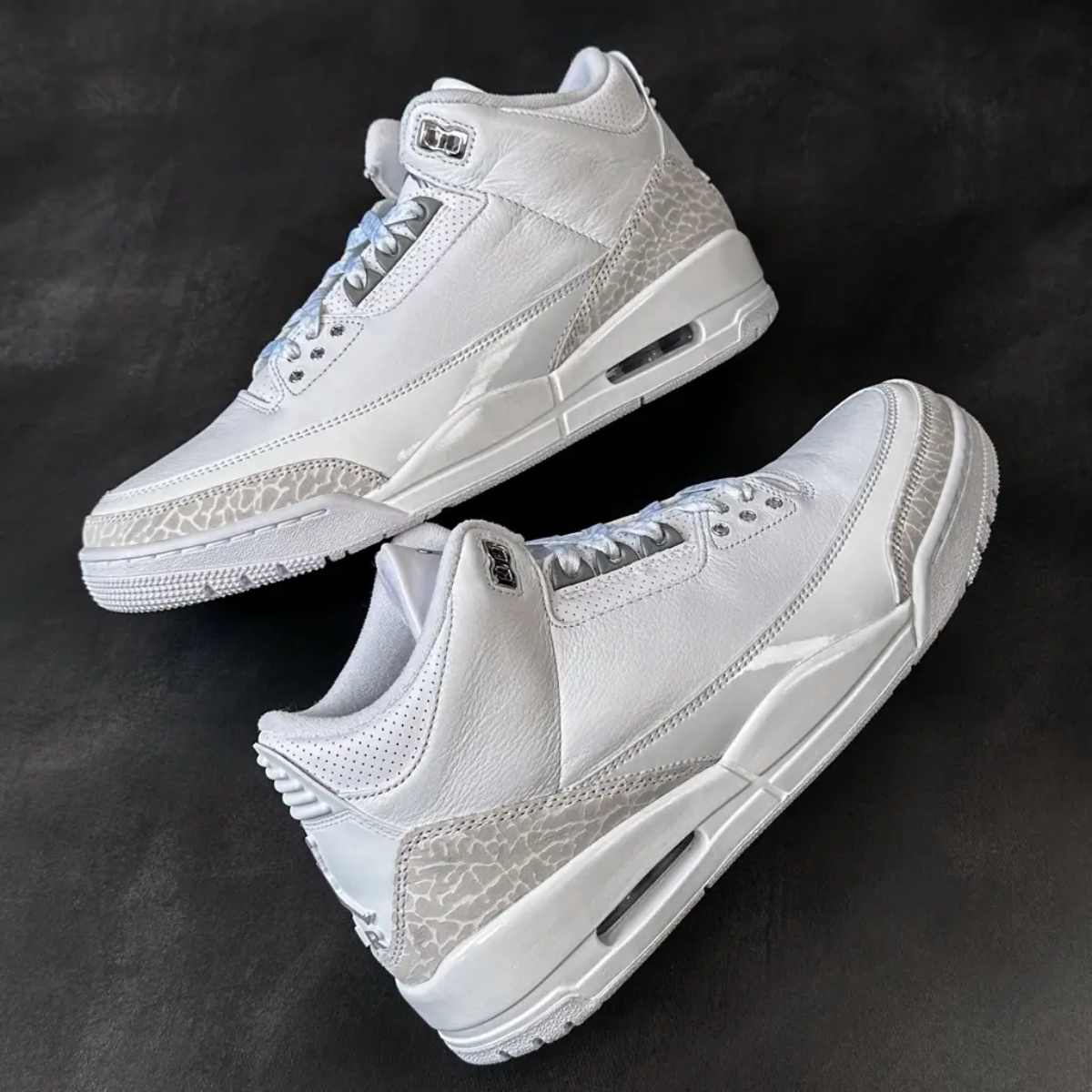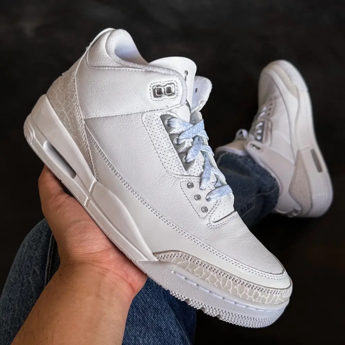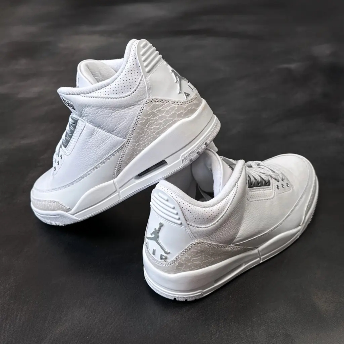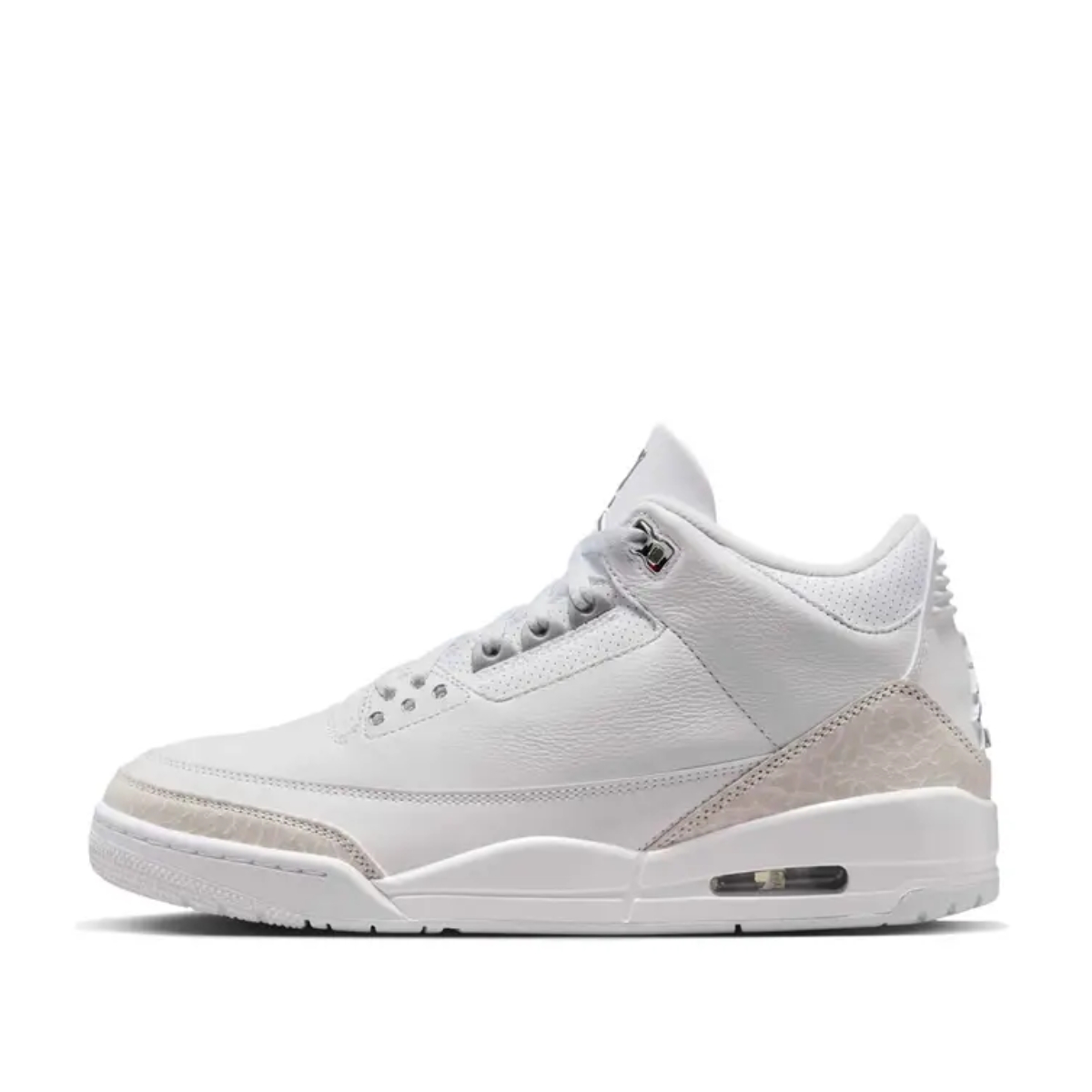 Điểm nổi bật nhất của Air Jordan 3 “Pure Money” nằm ở sự tinh giản trong phối màu nhưng lại vô cùng sang trọng. Toàn bộ phần thân giày được bao phủ bởi chất liệu da trắng tumbled cao cấp, tạo cảm giác sạch sẽ, cao cấp và dễ phối đồ. Những chi tiết quen thuộc của dòng Jordan 3 như họa tiết da voi (elephant print) được giữ lại ở mũi và gót giày, nay được làm mềm hơn với tông xám nhạt nhẹ nhàng, hài hòa.