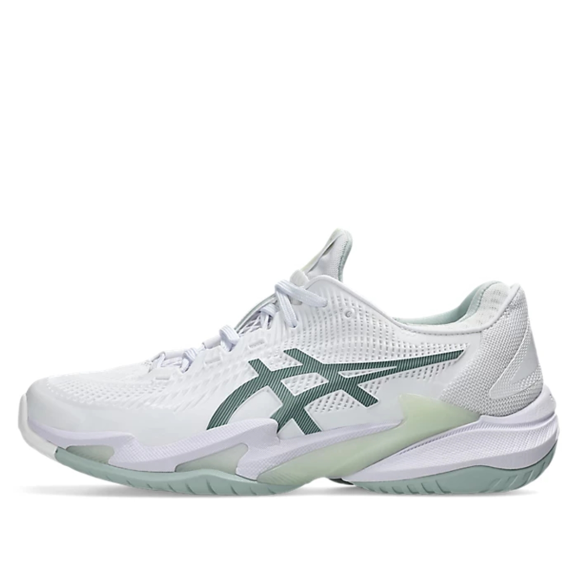 Giày Asics Court FF 3 ‘White Lichen Rock’ là mẫu giày thi đấu sân cứng dành cho nữ với thiết kế thanh lịch, phối màu trắng kết hợp tông màu Lichen Rock trung tính. Giày có cấu trúc không lưỡi giày (tongue-less) và thiết kế dạng mono‑sock giúp ôm sát bàn chân, giảm áp lực từ các đường may và tăng sự ổn định khi di chuyển.