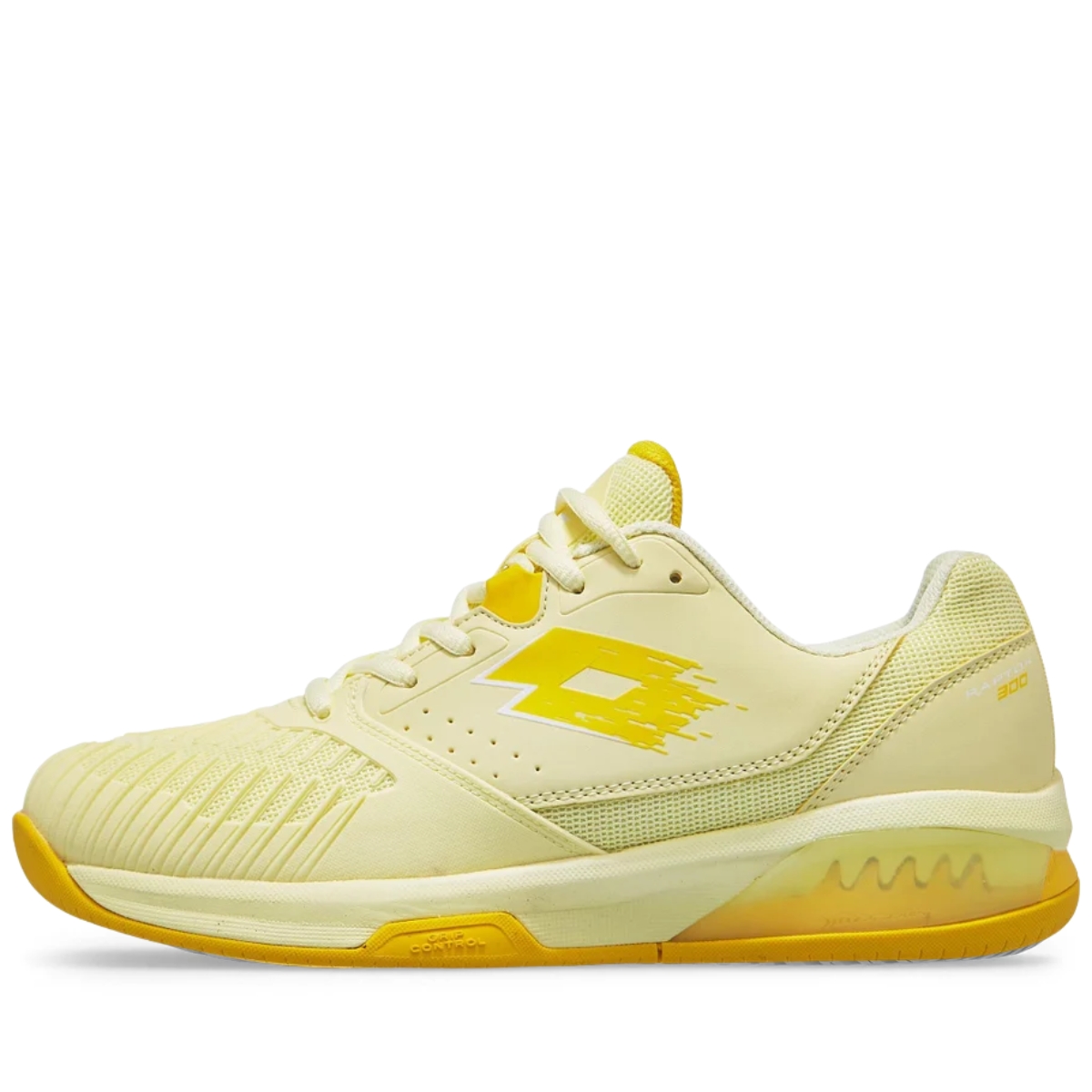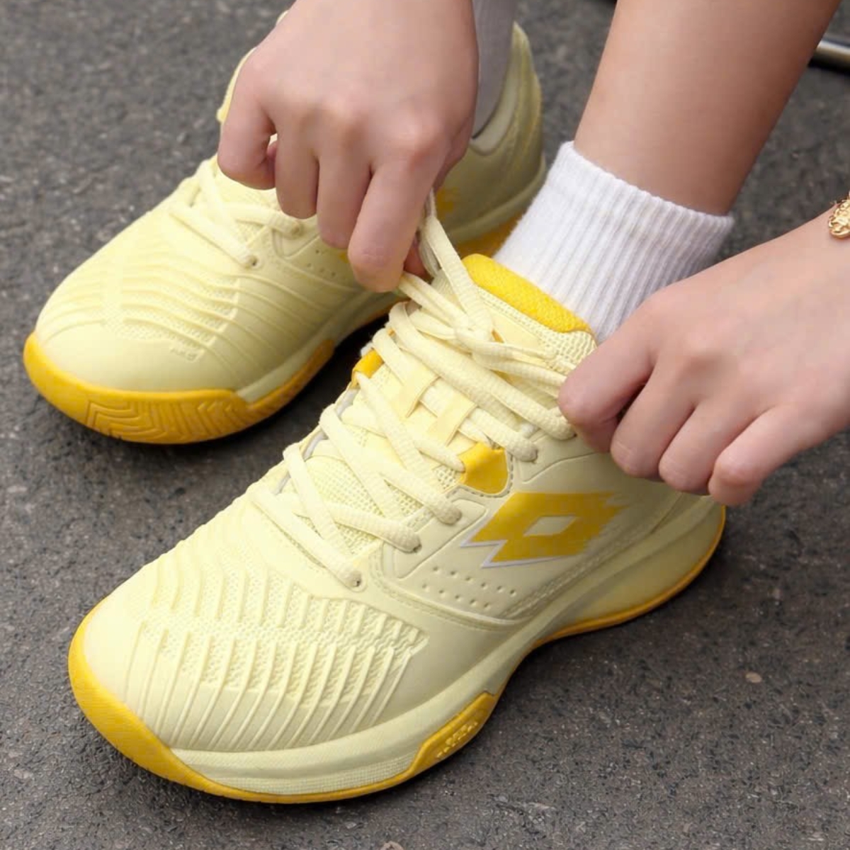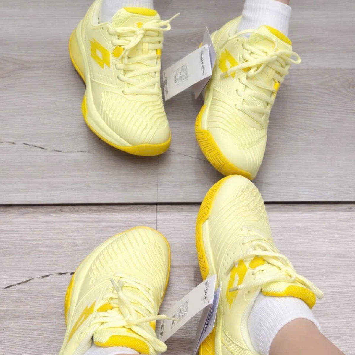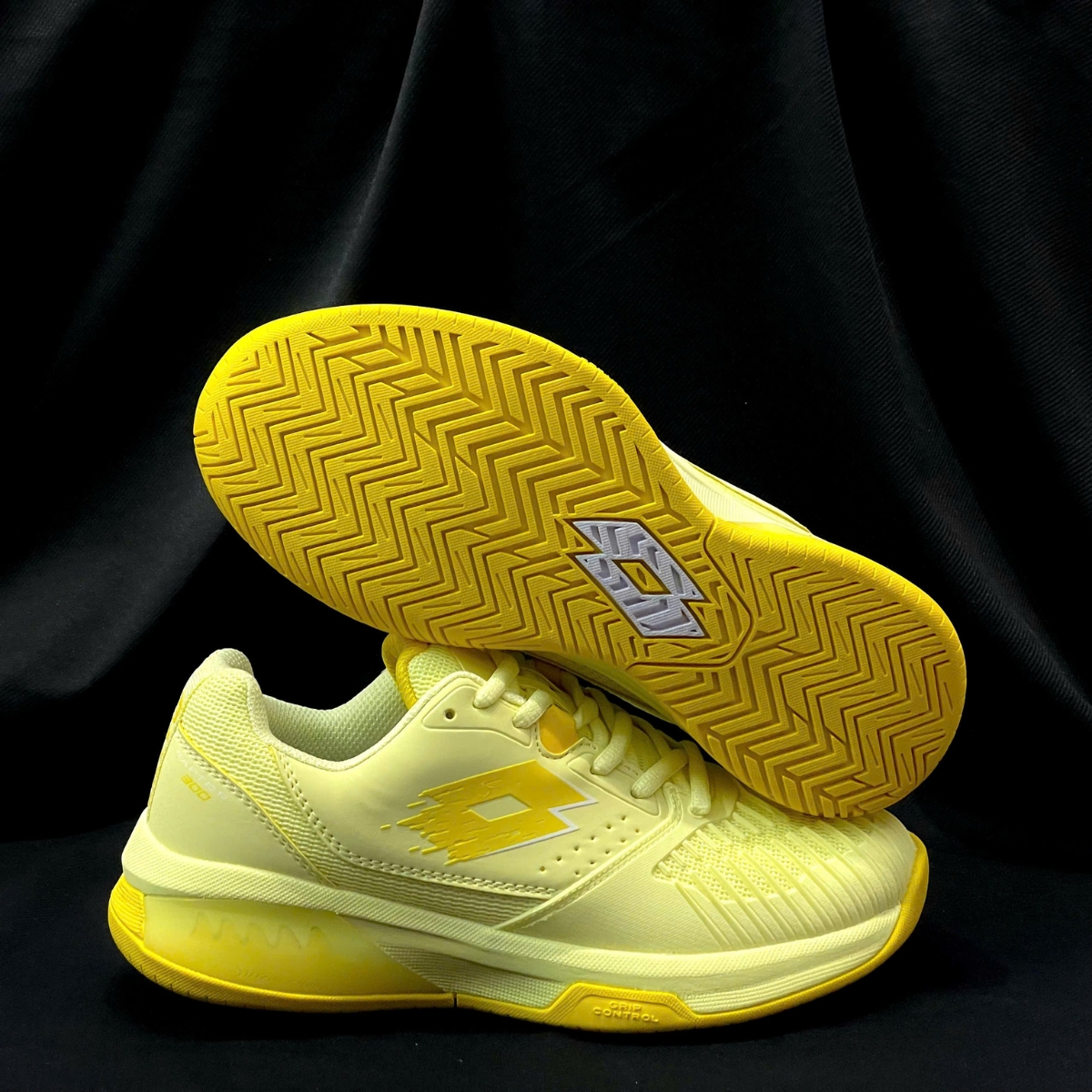 Giày tennis – pickleball Lotto Raptor 300 màu vàng nổi bật, phù hợp cho cả thi đấu và sử dụng hàng ngày. Phần thân giày được làm từ vật liệu lưới và tổng hợp cao cấp, giúp thoáng khí tốt, tạo cảm giác thoải mái khi mang trong thời gian dài.