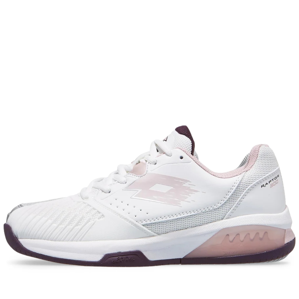 Giày Lotto Raptor Hyperpulse 300 phiên bản All White phối Hushed Violet là đôi giày thể thao thiết kế cho người chơi tennis và pickleball, kết hợp hiệu năng thi đấu cao với kiểu dáng hiện đại, dễ phối trang phục.