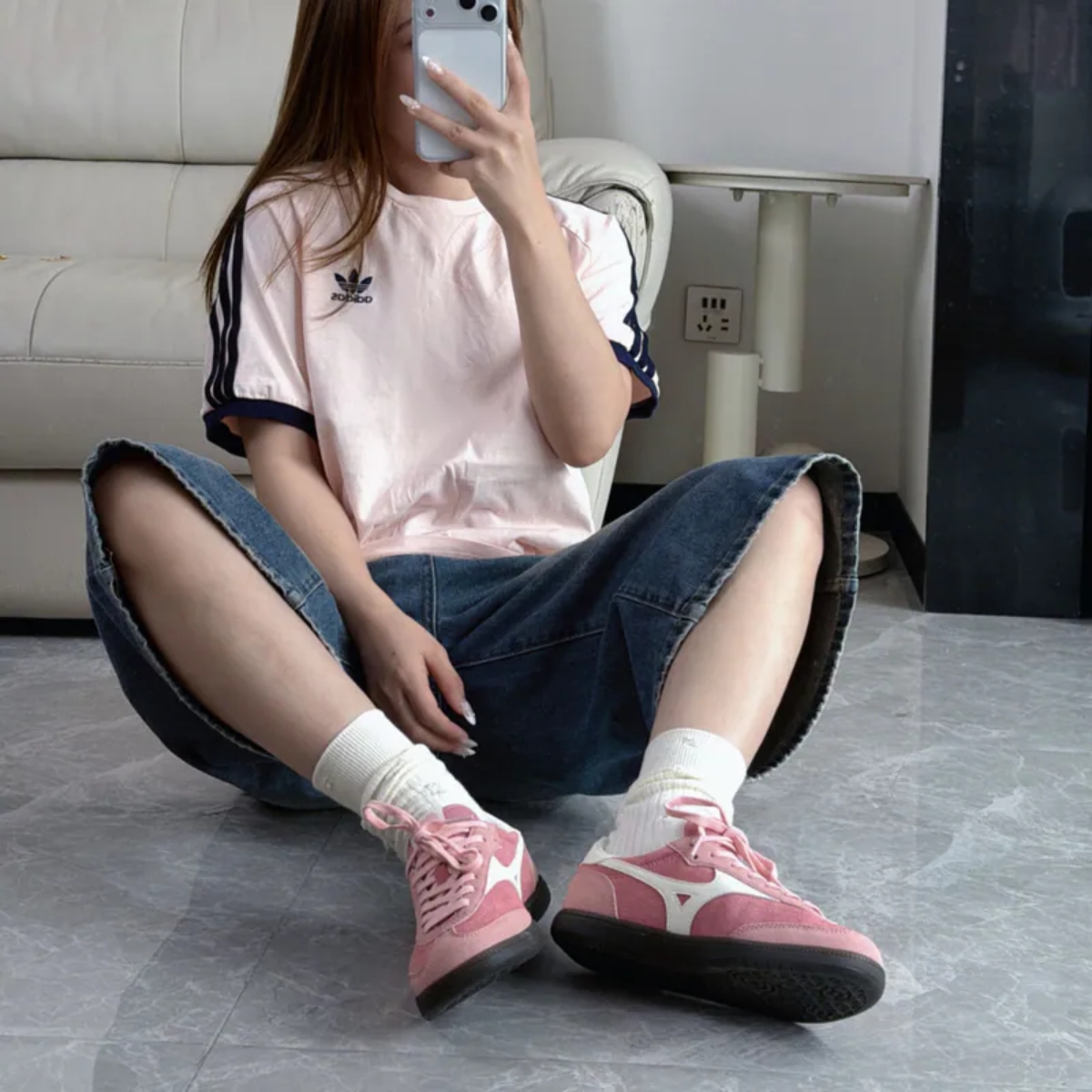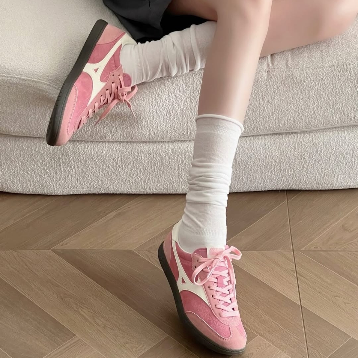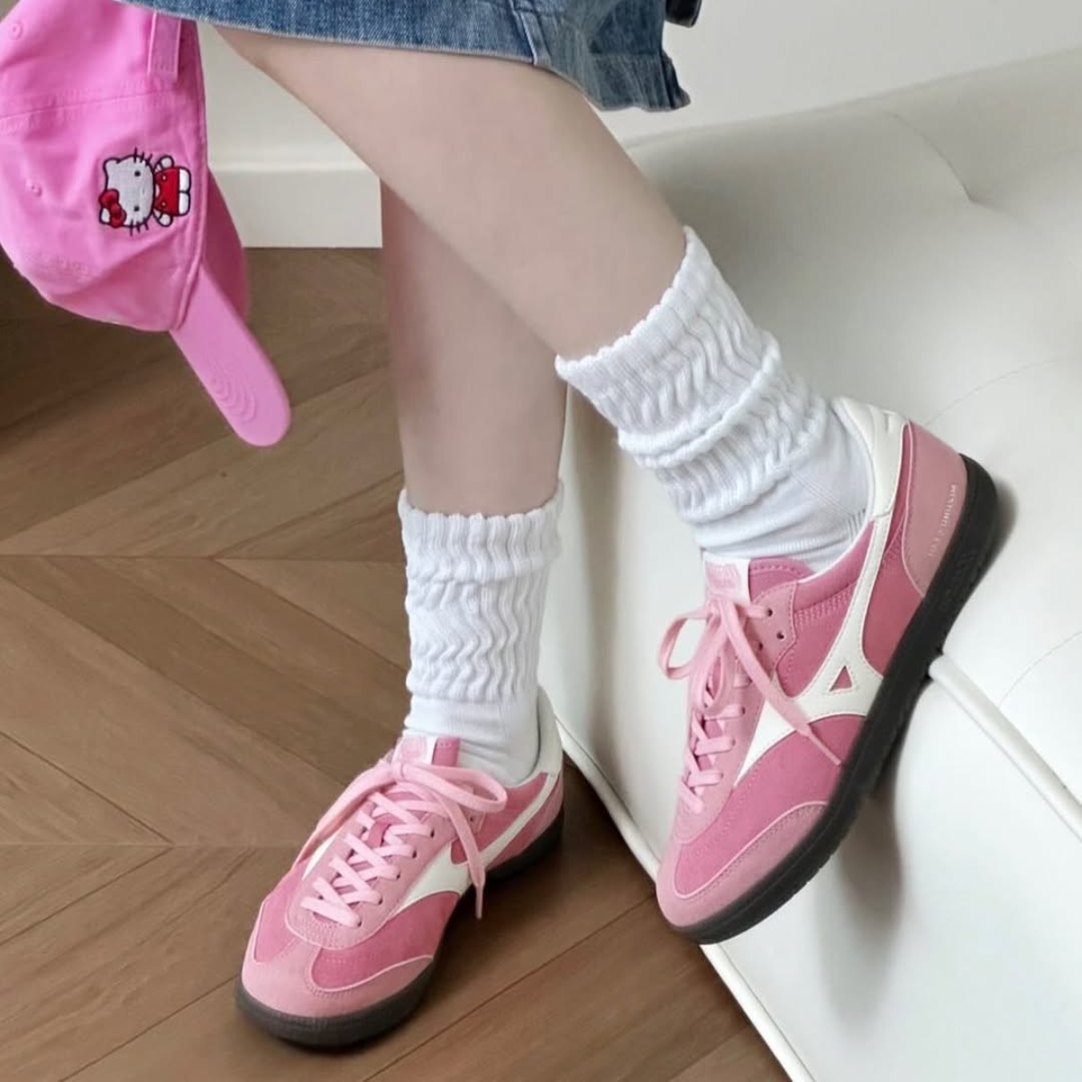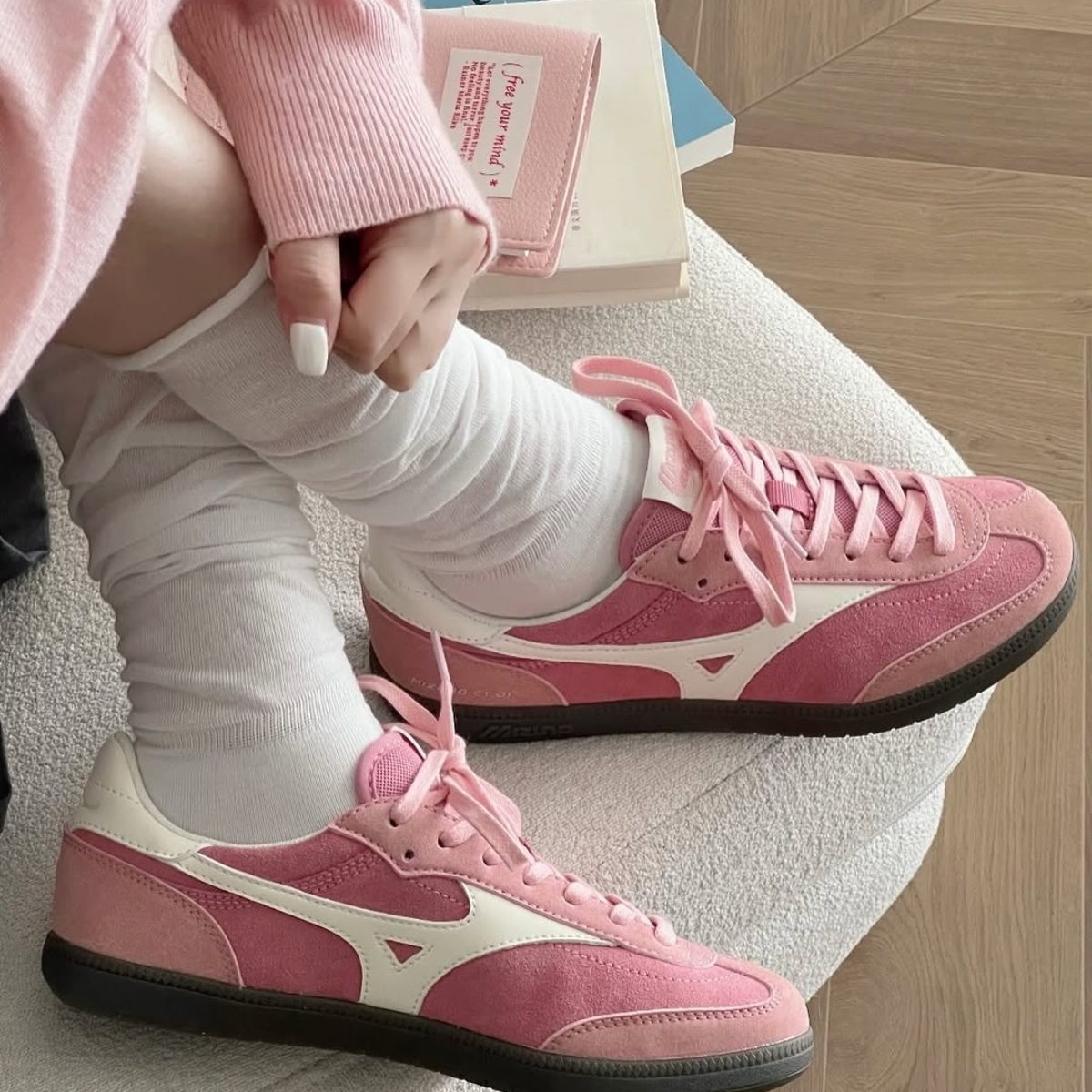 Phối màu hồng và trắng tạo nên vẻ ngoài trẻ trung, nổi bật nhưng vẫn dễ phối với nhiều trang phục khác nhau. Logo Mizuno đặc trưng được đặt ở hai bên thân giày, tăng thêm tính nhận diện và nét thể thao.