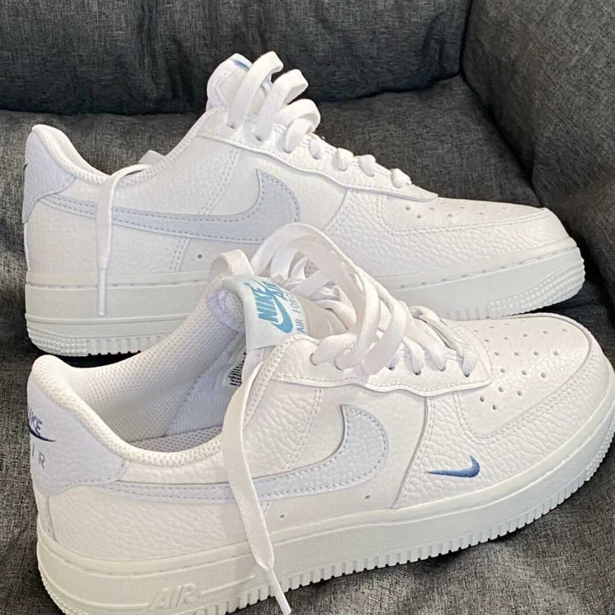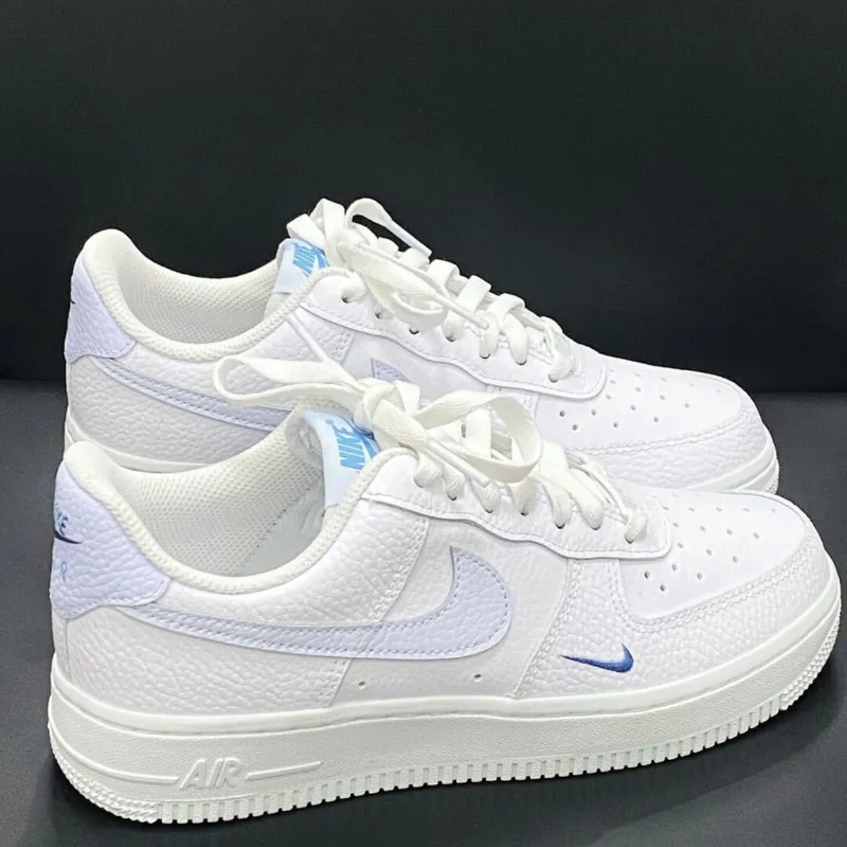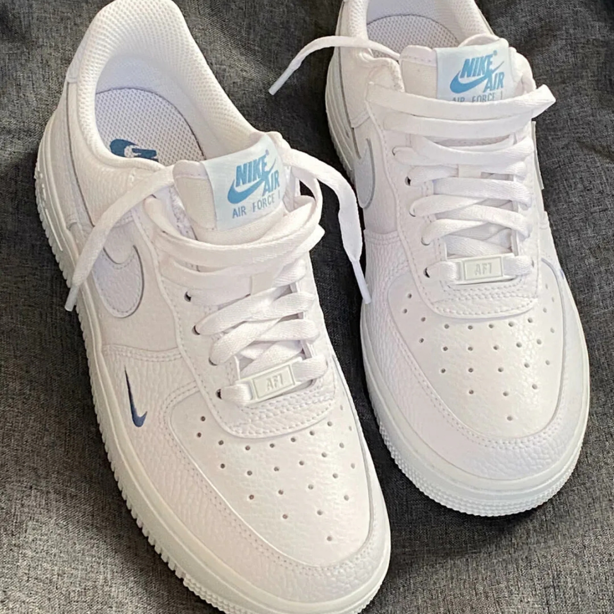 - Logo và chi tiết thương hiệu: Logo Nike Swoosh màu Aegean Storm nổi bật trên hai bên của giày. Các chi tiết khác như Nike Air trên lưỡi gà và gót giày thể hiện sự quen thuộc và đặc trưng của dòng Air Force 1.