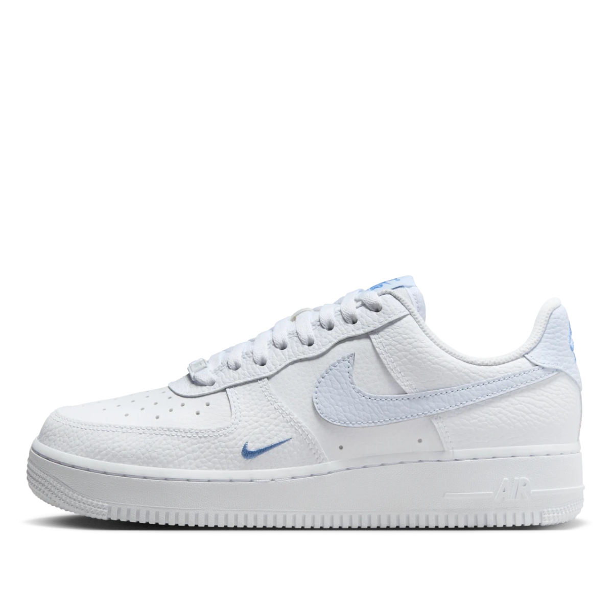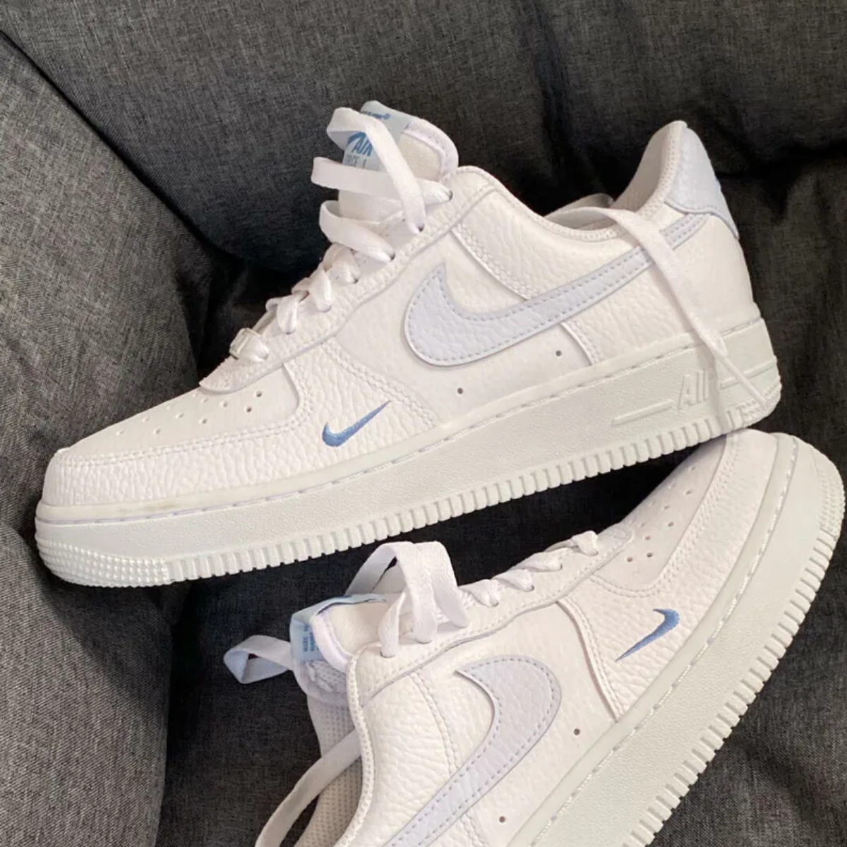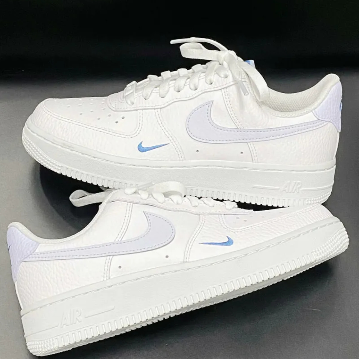 - Logo và chi tiết thương hiệu: Logo Nike Swoosh màu Aegean Storm nổi bật trên hai bên của giày. Các chi tiết khác như Nike Air trên lưỡi gà và gót giày thể hiện sự quen thuộc và đặc trưng của dòng Air Force 1.