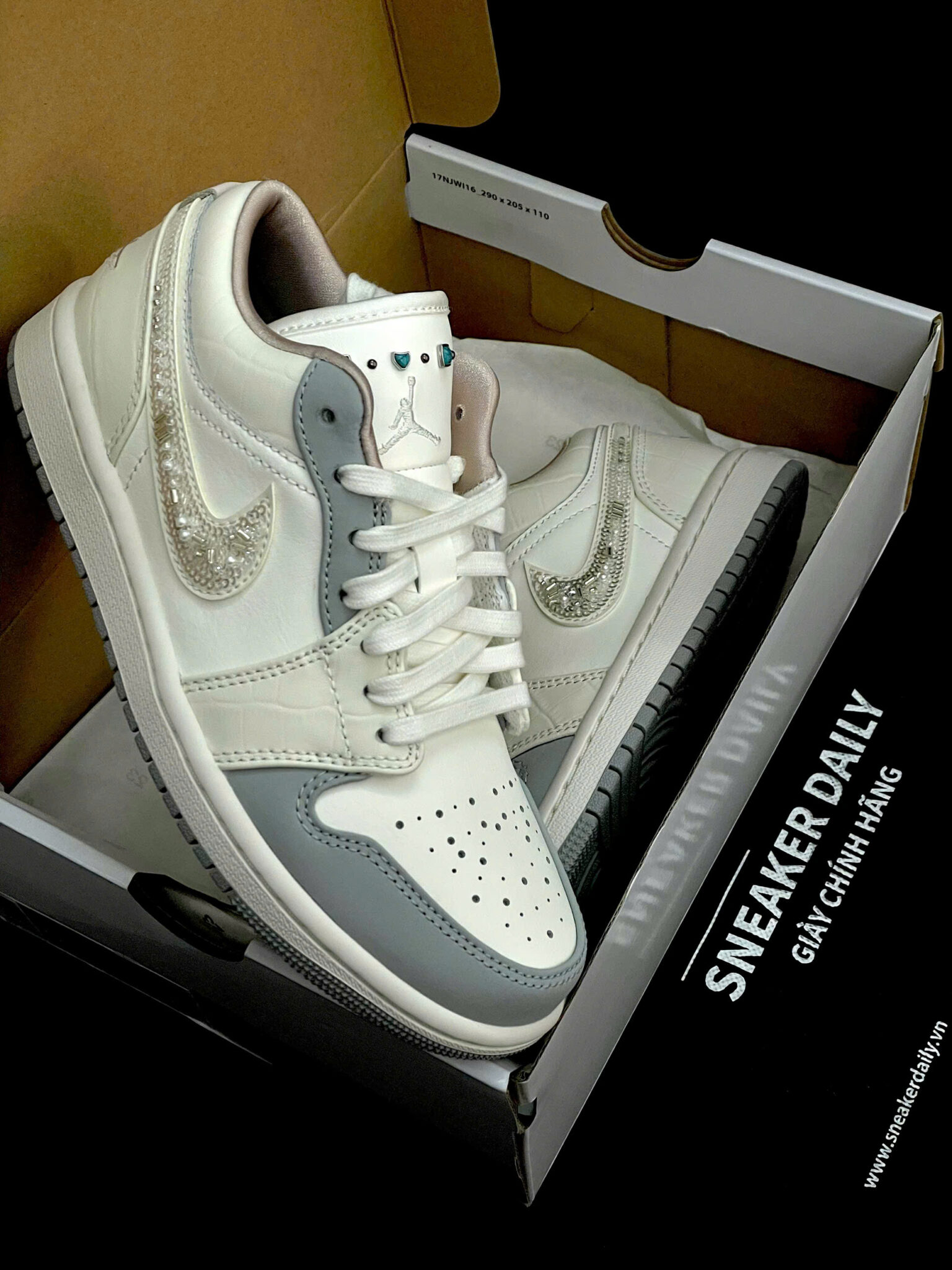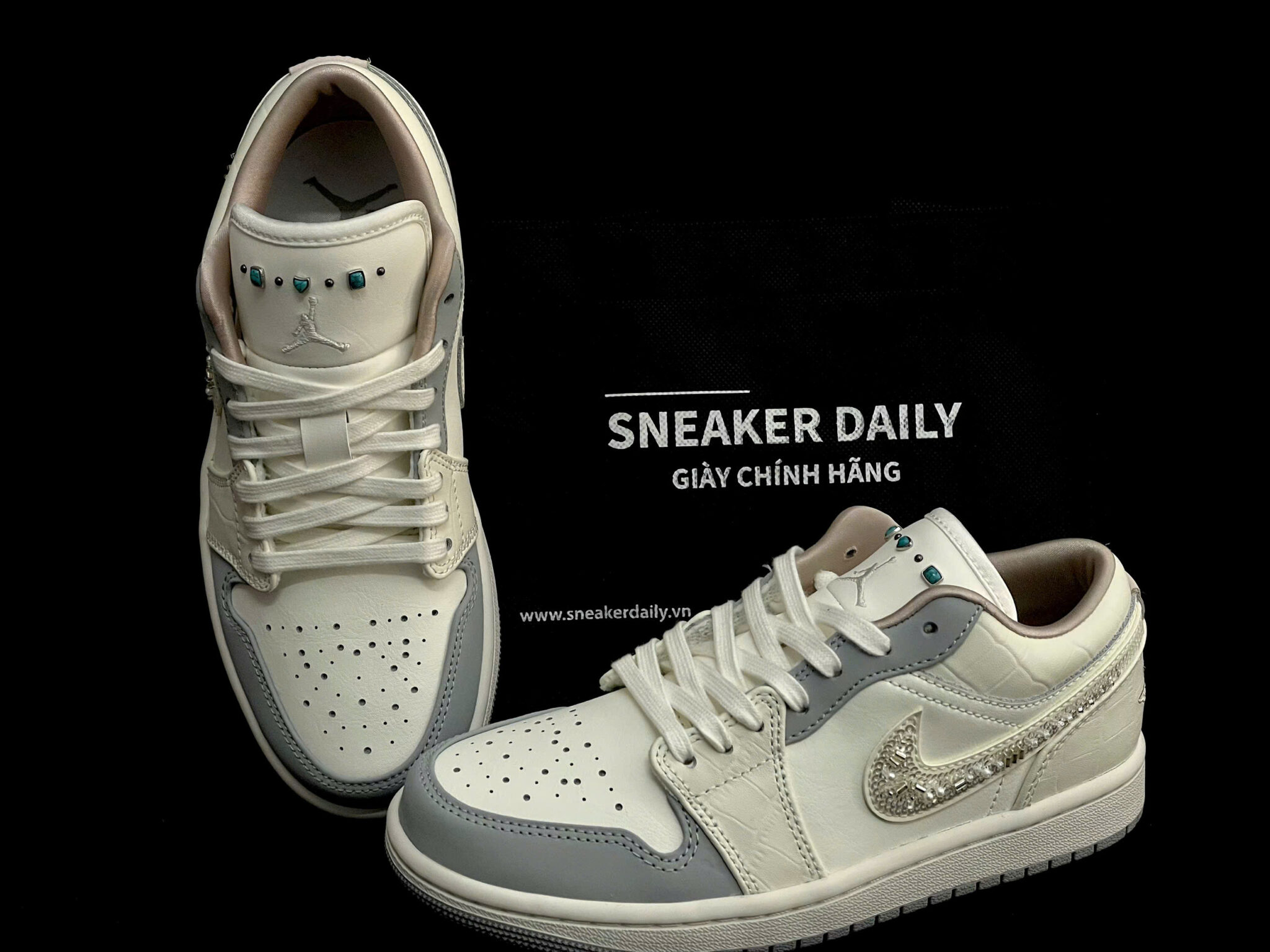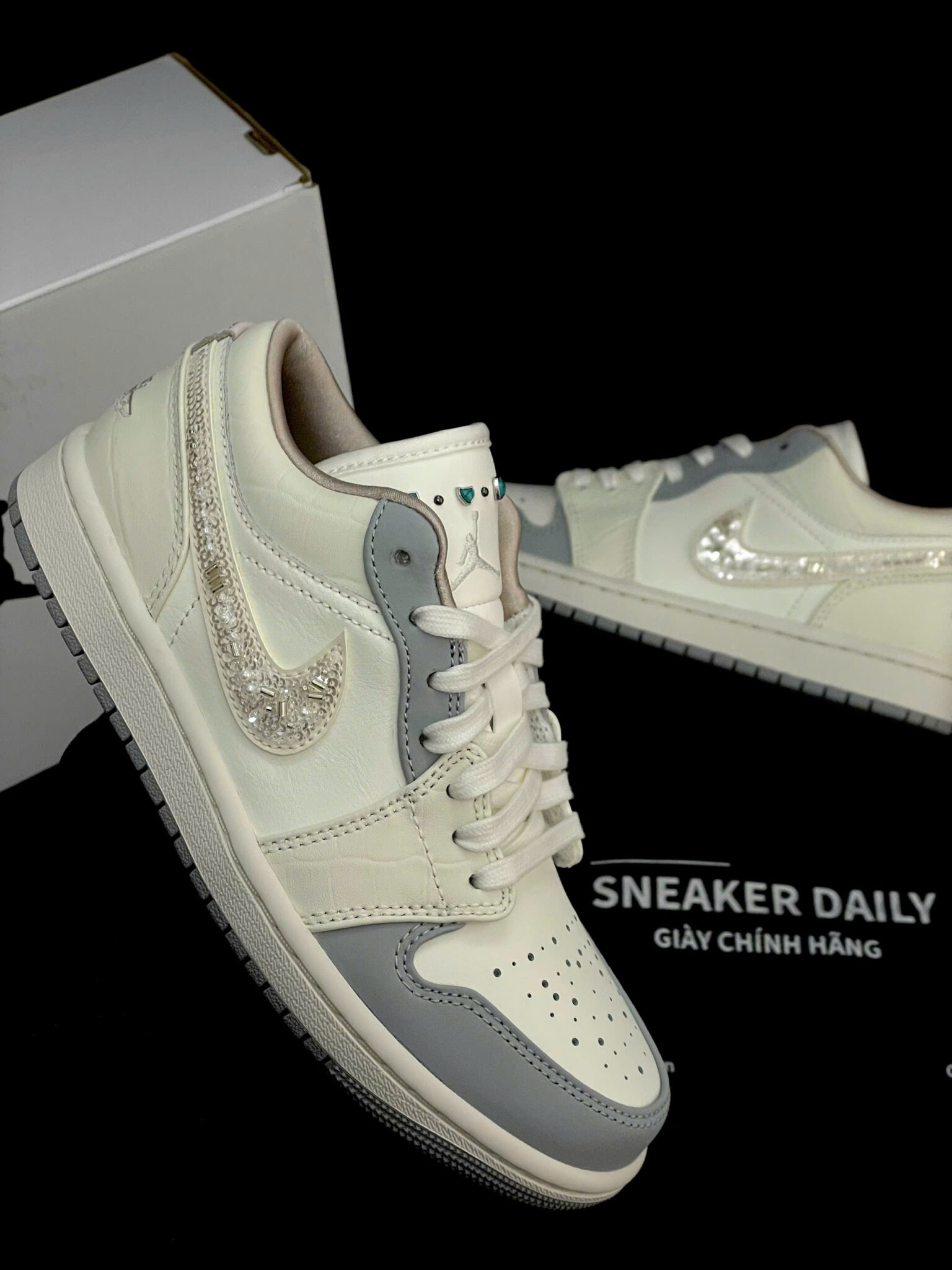 Trên lưỡi giày có các chi tiết giống ngọc trai, tạo điểm nhấn độc đáo, khác biệt so với phiên bản thường.