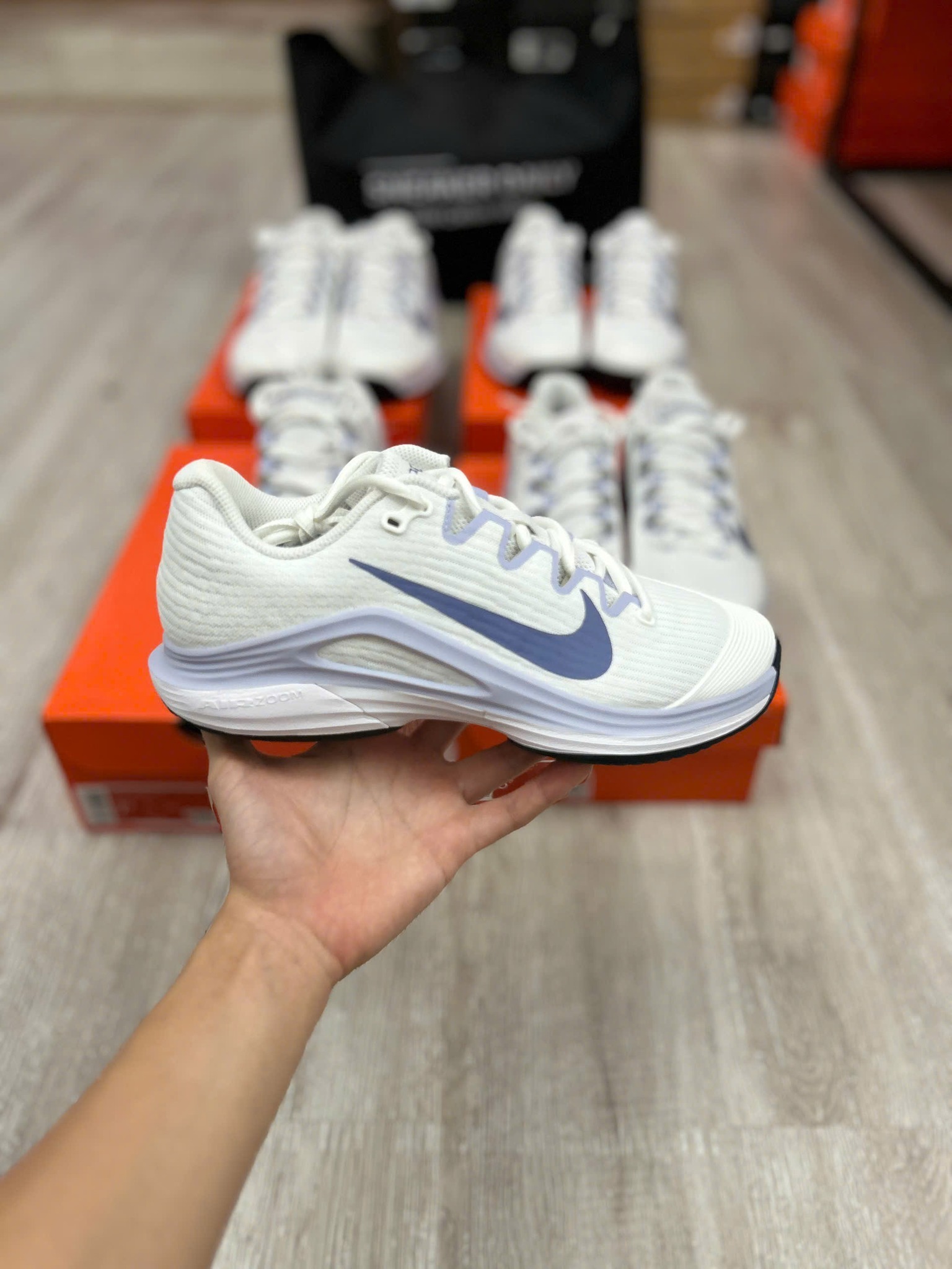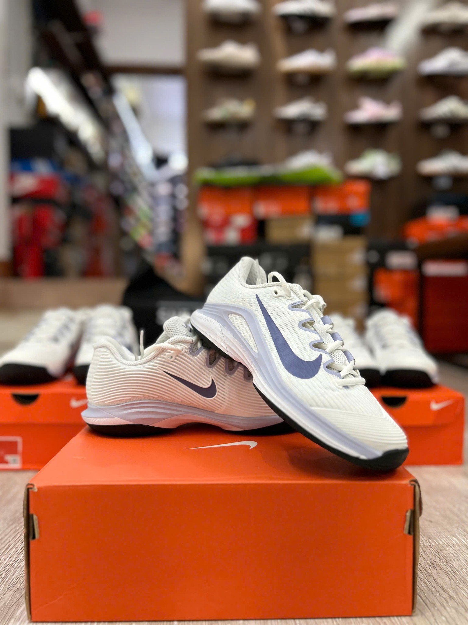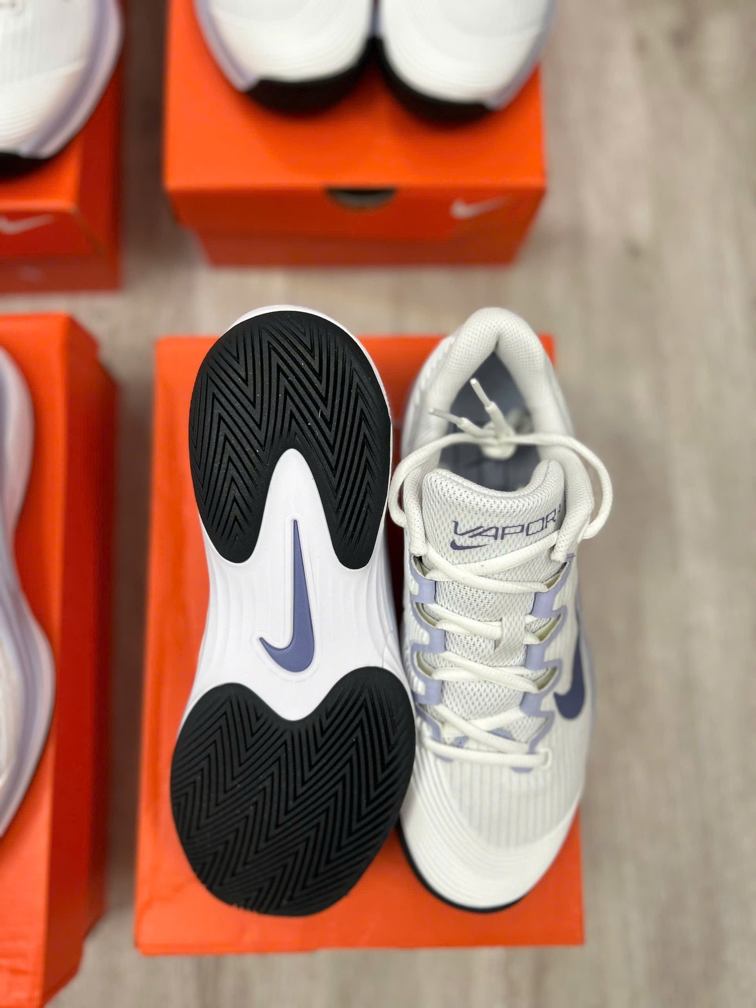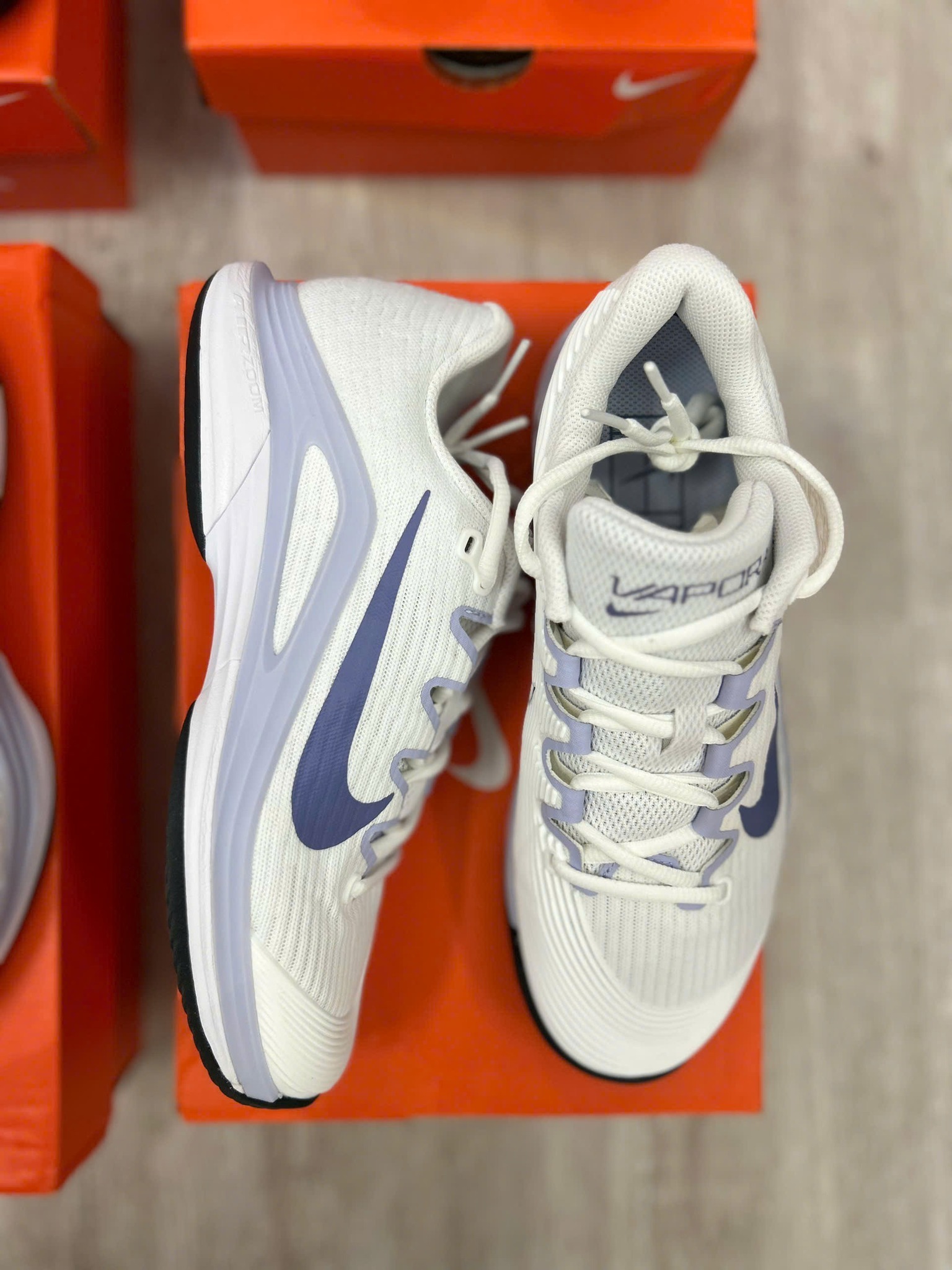 Nike Court Air Zoom Vapor 12 HC là mẫu giày tennis cao cấp được thiết kế dành riêng cho sân cứng. Với phối màu trắng chủ đạo kết hợp sắc xanh Indigo và xám Ghost tinh tế, đôi giày mang đến vẻ ngoài hiện đại, năng động nhưng vẫn giữ được nét tối giản đặc trưng của dòng Vapor. Mẫu này là phiên bản kế tiếp của Vapor 11, với nhiều cải tiến về trọng lượng và độ linh hoạt, giúp người chơi di chuyển mượt mà và phản hồi nhanh hơn trong từng bước chạy.