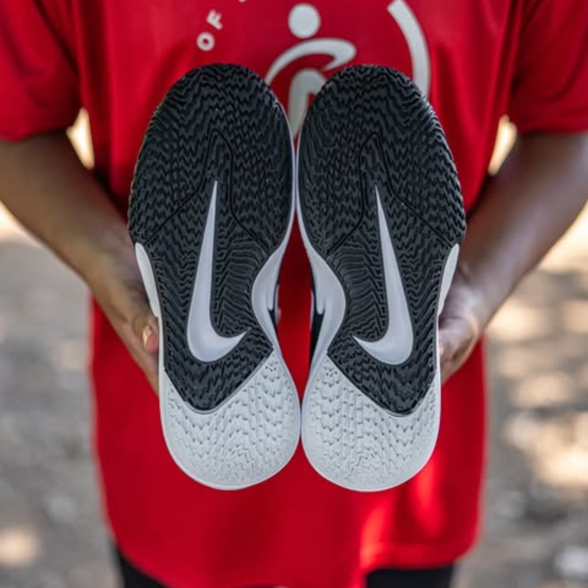 - Phần upper (phần trên của giày) được làm từ vải lưới (mesh) kết hợp với da tổng hợp, giúp giày nhẹ, thoáng khí và dễ dàng ôm vừa vặn với chân. Thiết kế này giúp duy trì sự thoải mái trong suốt cả trận đấu hoặc trong các bài tập thể thao.