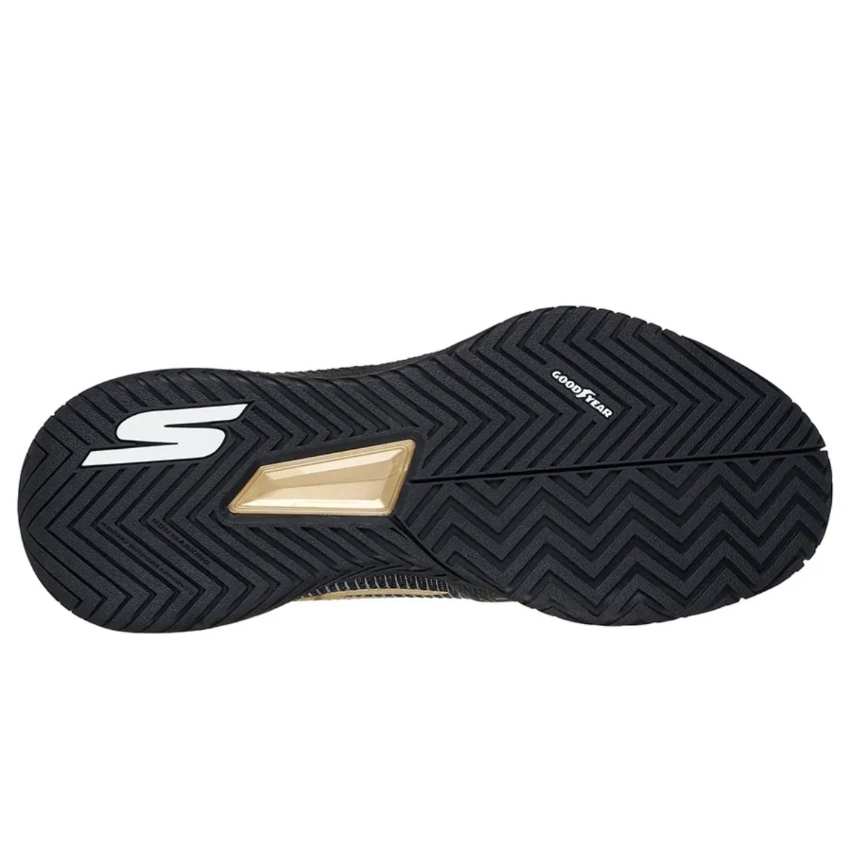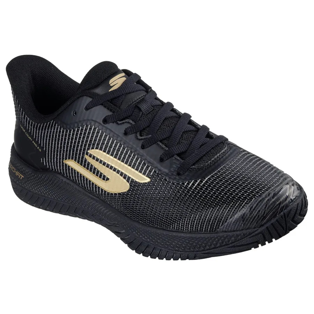 Giày Skechers Viper Court Pro 2.0 ‘Black Gold’ 246109C-BKGD là đôi giày pickleball/tennis hiệu năng cao, được thiết kế để mang lại sự kết hợp hoàn hảo giữa tốc độ, ổn định và cảm giác êm ái vượt trội cho người chơi trên mọi mặt sân. Với tông màu đen huyền bí làm nền, được điểm xuyết bởi những chi tiết vàng kim lấp lánh, đôi giày toát lên vẻ sang trọng, đẳng cấp và đầy quyền lực.