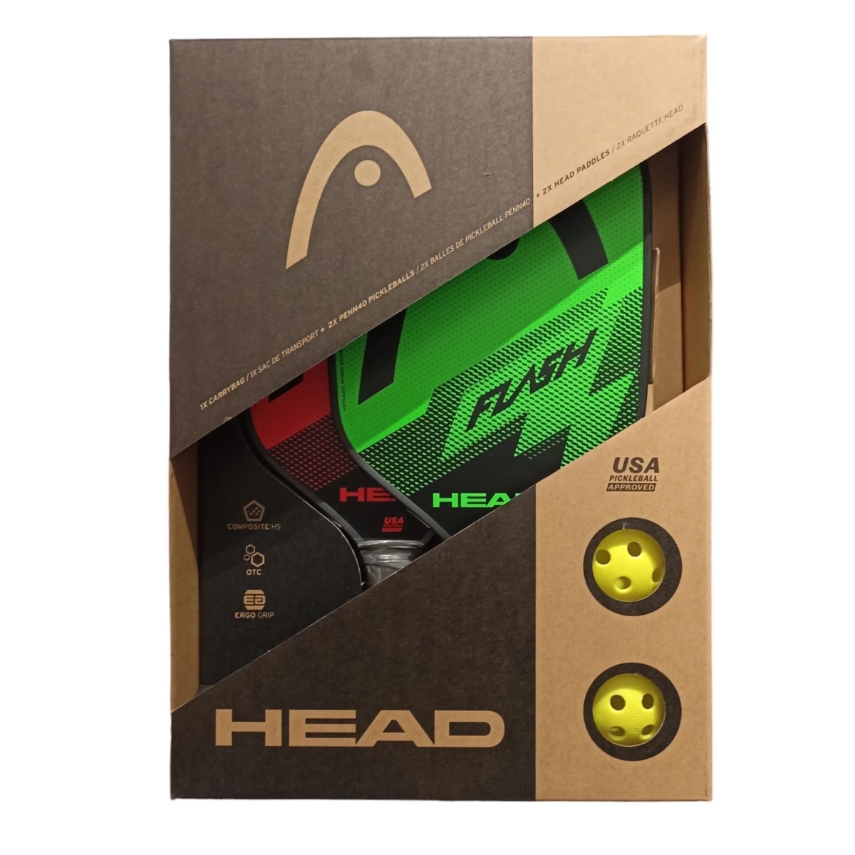 – Vợt PickleBall Head Pack Flash bao gồm 2 cây vợt vợt PickleBall Head Pack Flash và 2 quả bóng Pickleball đi kèm vô cùng tiện lợi cho những ai tìm 1 set vợt đầy đủ phụ kiện và tiết kiệm.